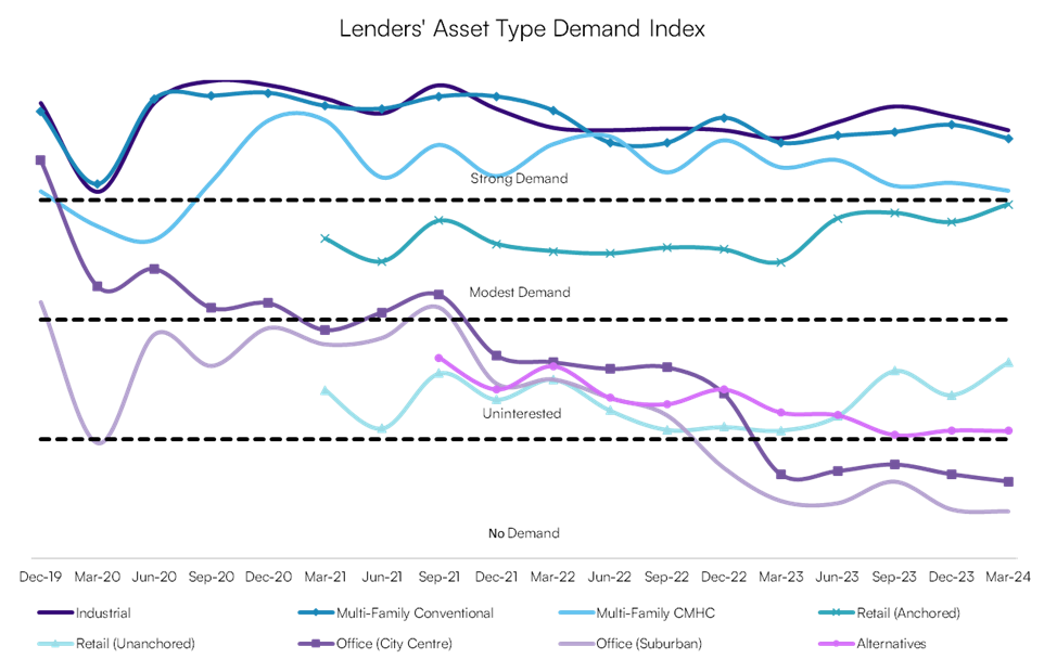 The Intellifi Lender Sentiment Survey is conducted quarterly to get a sense of lender appetites and interest across the Canadian lending landscape. The most recent report from Q1 2024 found that demand is mostly unchanged from the end of 2023. Demand for multifamily, industrial, and anchored retail maintained their spots as the most favored asset classes among lenders. One surprising shift in the quarter was the sharp uptick in demand for unanchored retail assets which has resurged on the surprising strength of retail in the post-pandemic era, a vast improvement since Q3 2022 when it was the least favored among survey participants. Office as indicated in the above, was the least favored asset class.